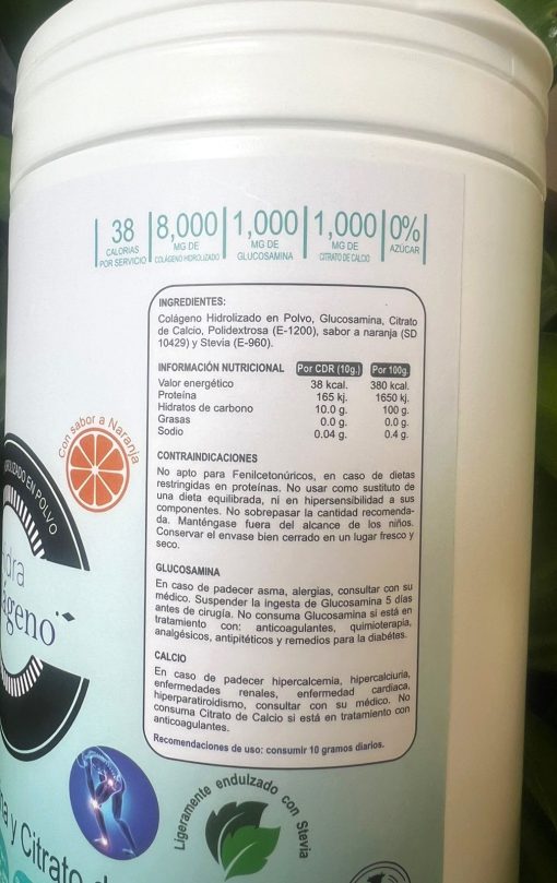 ✅CONTENIDO: 8000 mg de Colágeno Hidrolizado, 1000mg Glucosamina, 1000mg citrato de Calcio, sabor naranja.